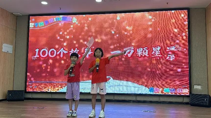 在表演节目环节,孩子们精心准备的手势舞、唱歌、朗诵等等节目,一个比一个精彩。老师结合100期故事还特意安排了一个百期故事回顾环节,有家长和学生分享活动的体验和收获,有特意为庆祝百期故事而创作的的诗歌朗诵《100个故事 一万颗星星》,还有老师精心制作的往期活动精彩瞬间视频《时光长廊》,勾起了许多家长和孩子们的温馨而美好的回忆。
