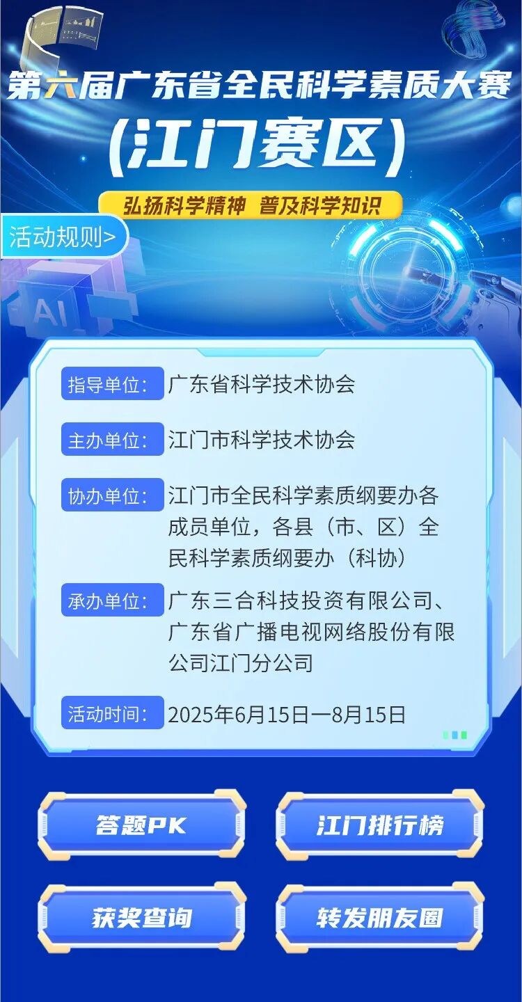一年一度科学素质大赛火热来袭! 去年江门以1100万参与人次 获全省第一! 今年,第六届科学素质大赛携 「本地奖励 + 省级奖励」 再度火力全开! 大赛时间 大赛设置 参与方式 奖项设置