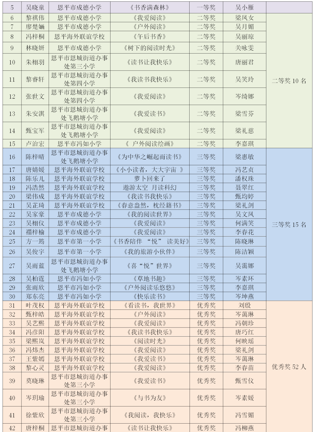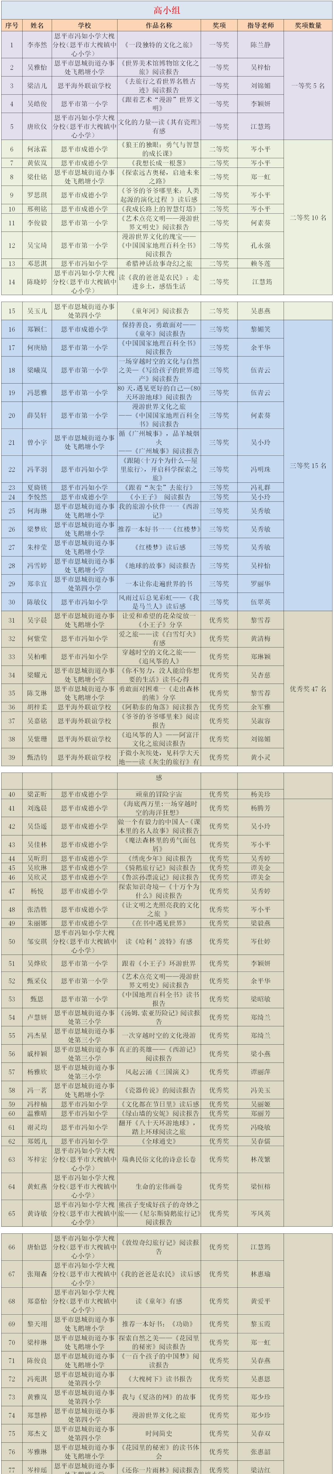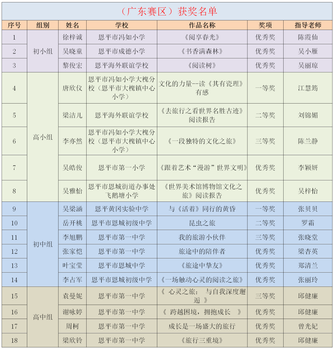 为鼓励青少年儿童拓展阅读领域,分享阅读的喜悦与情感,2024年12月,恩平市图书馆积极承办由广东省立中山图书馆组织开展的“阅读——我的旅游小伙伴”2025年世界读书日粤港澳创作比赛,比赛得到恩平市中小学校和学生的关注,学校积极组织学生参与。 本次比赛共设四个比赛分组,初小组以“户外阅读乐悠悠”为主题进行水彩画绘制形式参赛,高小组、初中组、高中组分别根据各自的主题:“漫游世界文化”“我的旅游小伙伴”“心灵之旅”,以读书征文形式参赛。本次比赛市图书馆共收集到4000多份作品,市图书馆组织有丰富评审经验的专业评委,对作品进行严格评审,共评选出245件优秀作品,其中一等奖19名、二等奖37名、三等奖60名,优秀奖129名。一、二、三等奖作品推荐到省参赛,最终,共有18份作品在省级评比中喜获佳绩,获得一等奖2名、二等奖2名、三等奖3名、优秀奖11名,充分展现了我市青少年儿童的文学素养与创作实力。祝贺以上获得省奖项的老师和同学!恩平赛区获奖情况 市图书馆组织有丰富评审经验的专业评委,对作品进行严格评审,评选出一等奖19名、二等奖37名、三等奖60名、优秀奖129名。143名教师被评为优秀指导老师,12所学校荣获优秀组织奖。
