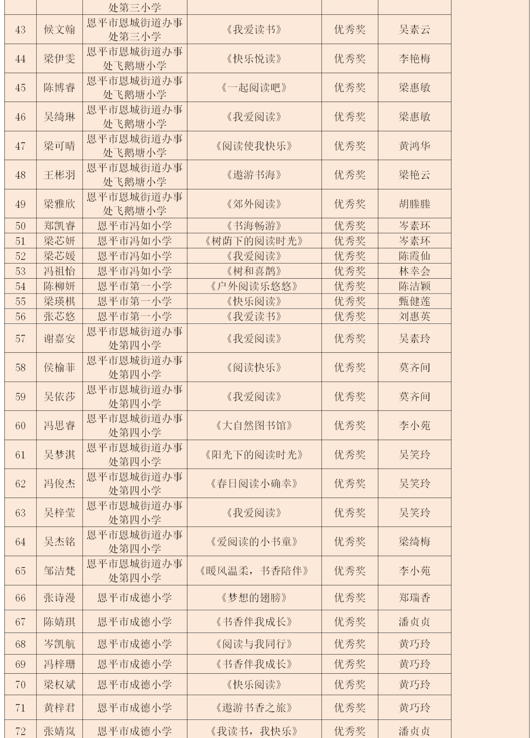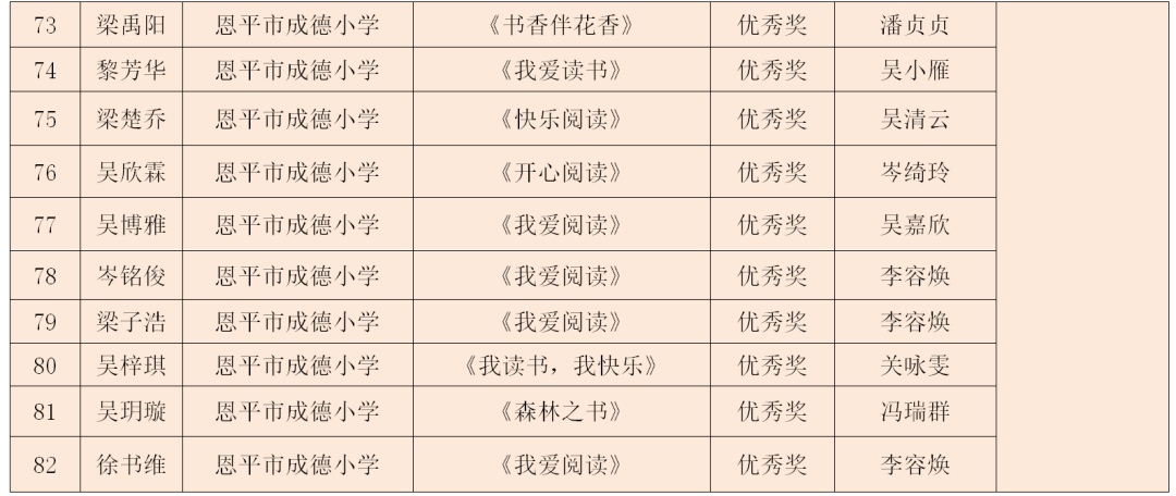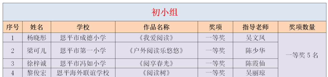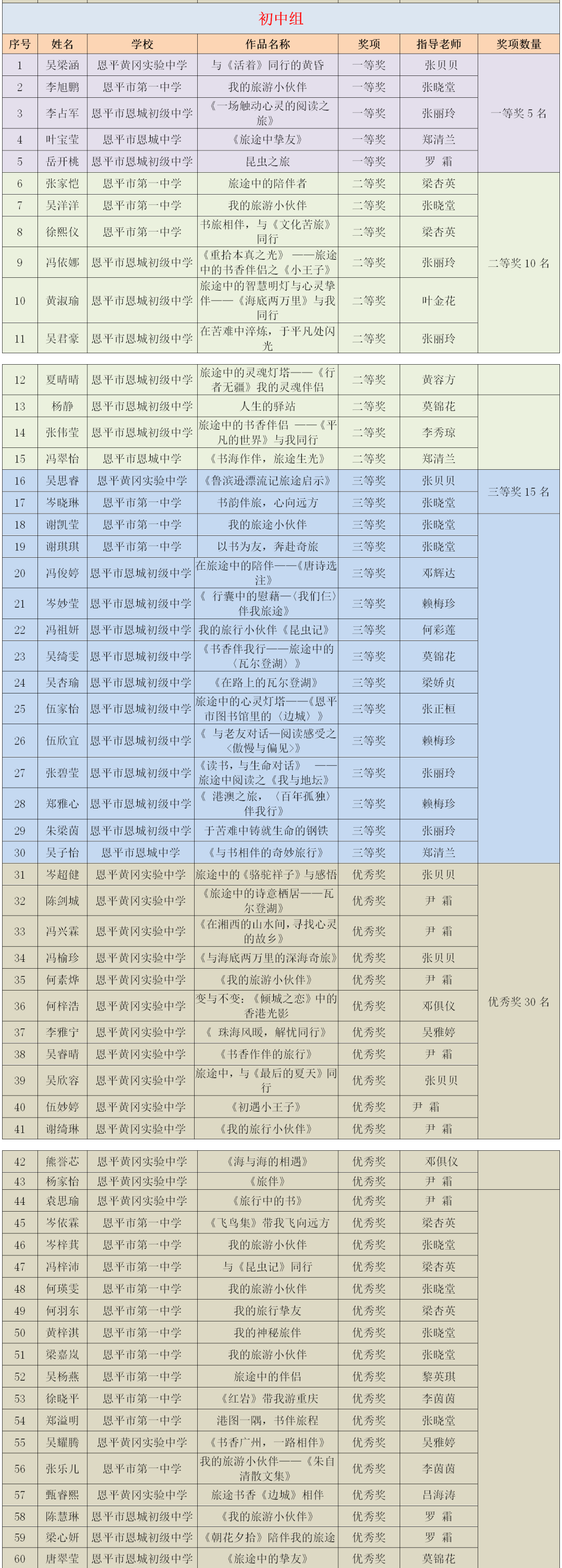 为鼓励青少年儿童拓展阅读领域,分享阅读的喜悦与情感,2024年12月,恩平市图书馆积极承办由广东省立中山图书馆组织开展的“阅读——我的旅游小伙伴”2025年世界读书日粤港澳创作比赛,比赛得到恩平市中小学校和学生的关注,学校积极组织学生参与。 本次比赛共设四个比赛分组,初小组以“户外阅读乐悠悠”为主题进行水彩画绘制形式参赛,高小组、初中组、高中组分别根据各自的主题:“漫游世界文化”“我的旅游小伙伴”“心灵之旅”,以读书征文形式参赛。本次比赛市图书馆共收集到4000多份作品,市图书馆组织有丰富评审经验的专业评委,对作品进行严格评审,共评选出245件优秀作品,其中一等奖19名、二等奖37名、三等奖60名,优秀奖129名。一、二、三等奖作品推荐到省参赛,最终,共有18份作品在省级评比中喜获佳绩,获得一等奖2名、二等奖2名、三等奖3名、优秀奖11名,充分展现了我市青少年儿童的文学素养与创作实力。祝贺以上获得省奖项的老师和同学!恩平赛区获奖情况 市图书馆组织有丰富评审经验的专业评委,对作品进行严格评审,评选出一等奖19名、二等奖37名、三等奖60名、优秀奖129名。143名教师被评为优秀指导老师,12所学校荣获优秀组织奖。