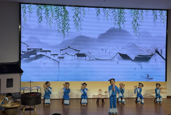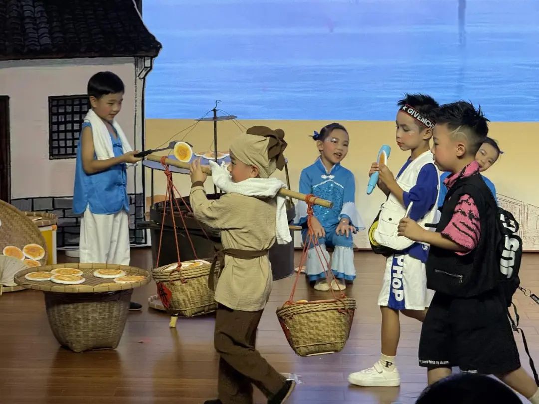 恩平文化底蕴深厚,本土原创民谣别具魅力。作品《恩平烧饼谣》以《吃过烧饼中状元》这首童谣为主线,精心创编了一场融合民俗韵味与童真趣味的非遗主题舞蹈。在这场舞蹈里,一些现代说唱男孩来到恩平旅游,与恩平烧饼产生了奇妙的“邂逅”;幼儿们则通过动作、表情和道具的巧妙结合,进行生动活泼的表演,以舞蹈语言诠释并宣传着匠人精神。此外,我们还巧妙融入了广府童戏元素,大大增强了舞蹈的互动感。舞蹈的基础旋律取自恩平木鱼调,同时融入了新说唱元素,让传统与活力实现了完美碰撞。