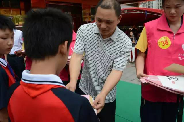 现场,一群身穿粉色马甲的义工团队非常亮眼,他们是恩平市职教中心的学生志愿者。义工们在活动开始前帮忙分发粽叶、食材等,活动进行时帮忙将包好的粽子收集好。