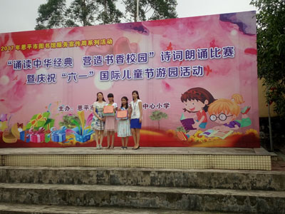 世界读书日过后,同学们的读书热情不退,为进一步活跃校园文化气氛,丰富校园文化生活,提高同学们对经典的阅读兴趣,营造良好的学习氛围,陶冶同学们高尚的道德情操。在图书馆服务宣传周到来之际,恩平市图书馆联合良西镇中心小学举办“诵读中华经典,营造书香校园”诗词朗诵比赛暨庆祝“六一”国际儿童节游园活动。