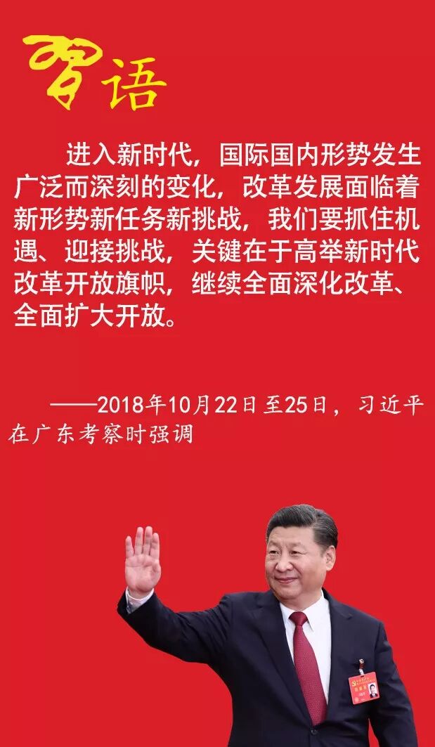 在此次考察中,习近平还提出了“新时代改革开放”的概念。习近平强调,进入新时代,国际国内形势发生广泛而深刻的变化,改革发展面临着新形势新任务新挑战,我们要抓住机遇、迎接挑战,关键在于高举新时代改革开放旗帜,继续全面深化改革、全面扩大开放。