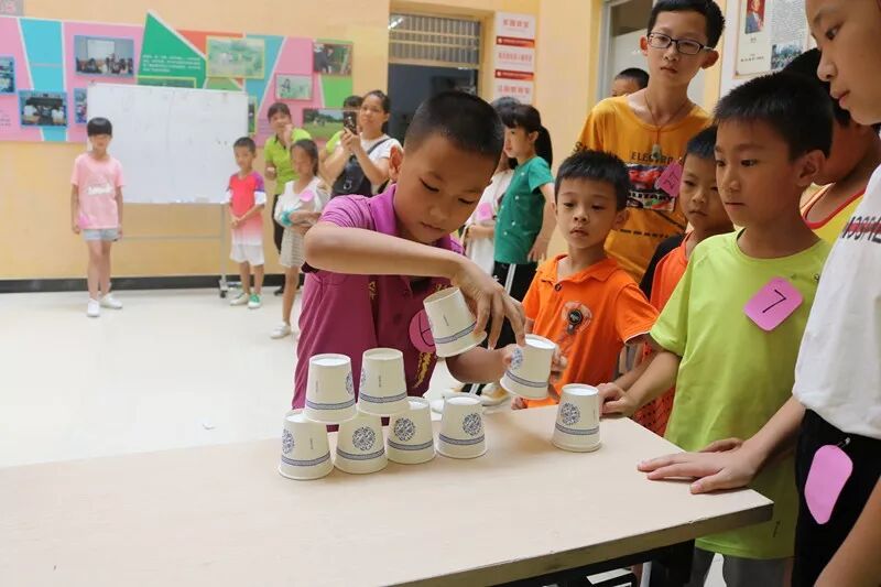 活动从热身游戏“抢凳子”开始,一阵阵青少年欢快笑声与热烈掌声加速营造了整个竞技活动的氛围。青少年在工作人员的组织下分成5个小队,他们首先需要完成“选队长—取队名—喊口号”的任务。然后,采用“团队赛”的形式,通过“一分钟跳绳”、“一分钟踢毽子”、“一分钟叠杯”的趣味竞技环节,最后全体青少年还应战“一站到底”的智力考验。这些环节考验了各队的团队凝聚力及配合默契度。