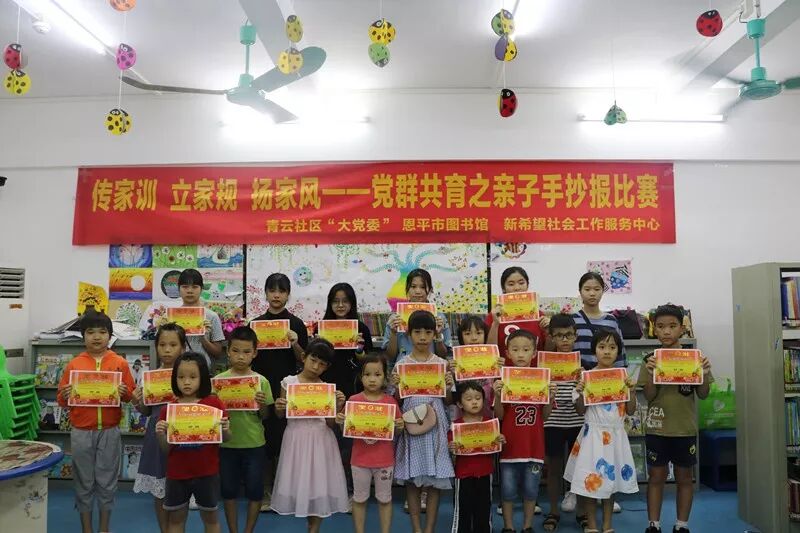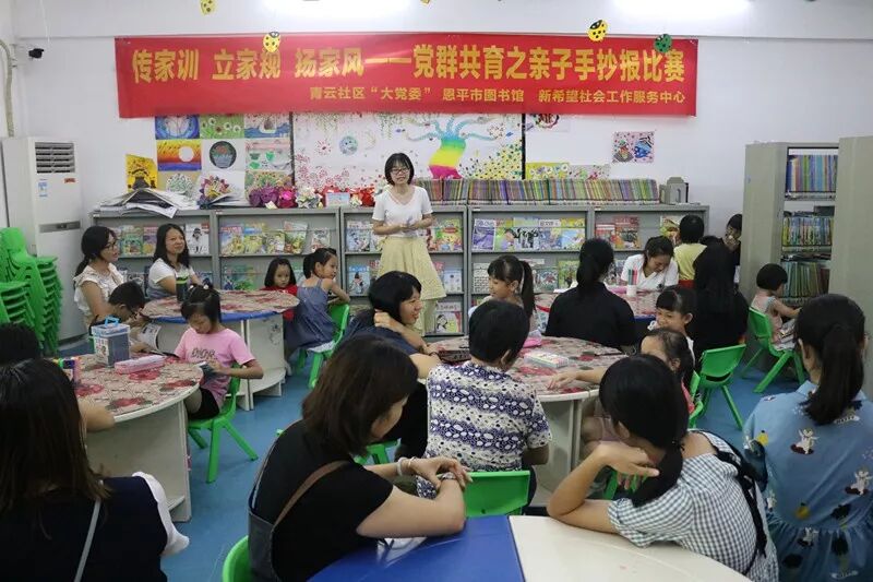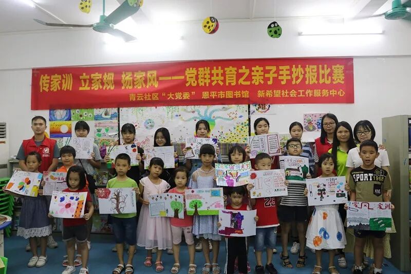 8月16日下午,恩平市图书馆携手青云社区“大党委”成员单位江门市恩平公路局、恩平市农业农村局在职党员贯彻落实习近平总书记注重家庭、注重家教、注重家风的重要指示精神,传承中华优秀文化和传统美德,弘扬清廉风尚,组织了社区内的党员、居民家庭在恩平市图书馆开展了以传家训,立家规,扬家风为主题的亲子手抄报比赛。